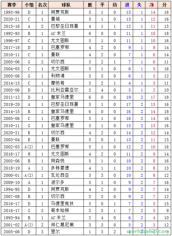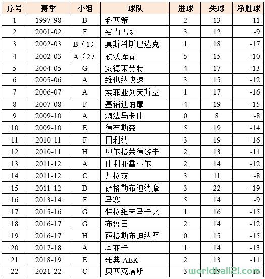 共有21支球队,累计22次创造了小组赛全败的战绩。值得一提的是,2011-12赛季的D组和2021-22赛季的C组,是史上唯二同时出现小组全胜和全败球队的分组。