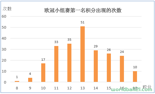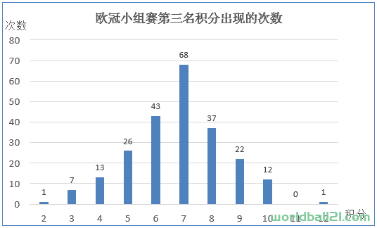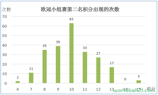 13分的次数最多,说明13分是小组第一的“及格线”。随着积分的增加和减少,次数也逐渐减少。可惜理论上没有17分,否则看起来就更像是标准的正态分布图了。小组全胜18分的有10次,前面已经详细描述;最低的8分,唯一的一次,正是以精明算计著称的意大利球队的代表尤文图斯(1998-99,B组,1胜5平)。