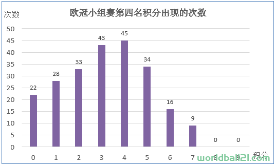 第四名的积分分布图,明显与前三名不太一样,这说明我在前面关于小组全败的可能性的推测是有一定道理的。这些球队除了实力的原因,更有可能是在出线无望的情况下,出工不出力,导致分布趋势向低分一侧倾斜。理论最高分(9分)、次高分(8分)都没有出现过。平均分是3.18。