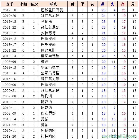 反之,小组头名进球性价比最低的是2017-18赛季的利物浦,他们进了23球,只拿到12分,比值为0.522;而小组第二名进球性价比最低的是1998-99的曼联,进了20球,得10分;以及2020-21的门兴,进16球,得8分。至于所有球队中最低的进球性价比,这其实是个数学问题,答案是0。如果从感性的角度去分析哪支球队的进球最“不值钱”,那就取决于小组0分的球队最多能进多少个球了(详见前文)。