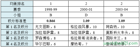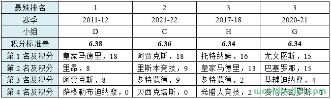 统计学上用标准差来衡量一组数据的离散程度,标准差越大,说明分布越不均匀。从这个角度,2011-12赛季的D组,是最“贫富悬殊”的小组。