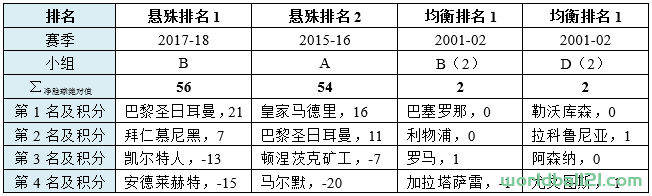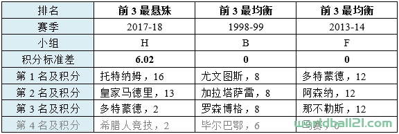 如果将评价的范围缩小到小组前3名,情况会怎样?没错,有两个小组再次出现,外加前文已经数次提及的12分第三的经典小组。很显然,1998-99的B组,2013-14的F组,是史上唯二的小组前三名同分的小组。