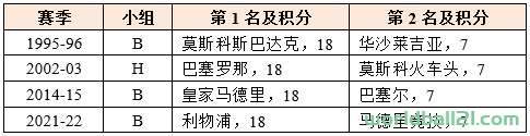 从统计学数据看,冠军来自小组头名的次数要比小组次名多得多。但也不乏以小组第二的身份最终夺冠的案例。这样的情况一共出现过9次,其中皇马占了3次,利物浦2次。