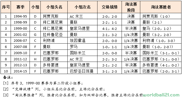 在这个统计中,巴塞罗那、曼联出境3次,AC米兰、拜仁、皇马各2次。曼联3次均为淘汰赛的胜者,两次为下风球队,堪称最命硬的球队;AC米兰两次以下风球队身份面对苦主,结局均是徒增新恨;拜仁连续两年称雄小组赛,却输在最后,对手还都是当年的冠军,堪称最苦命。