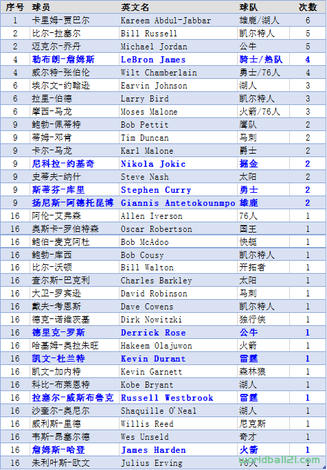 【NBA】历届NBA最有价值球员(MVP)及个人、球队统计(截至2021-22赛季)