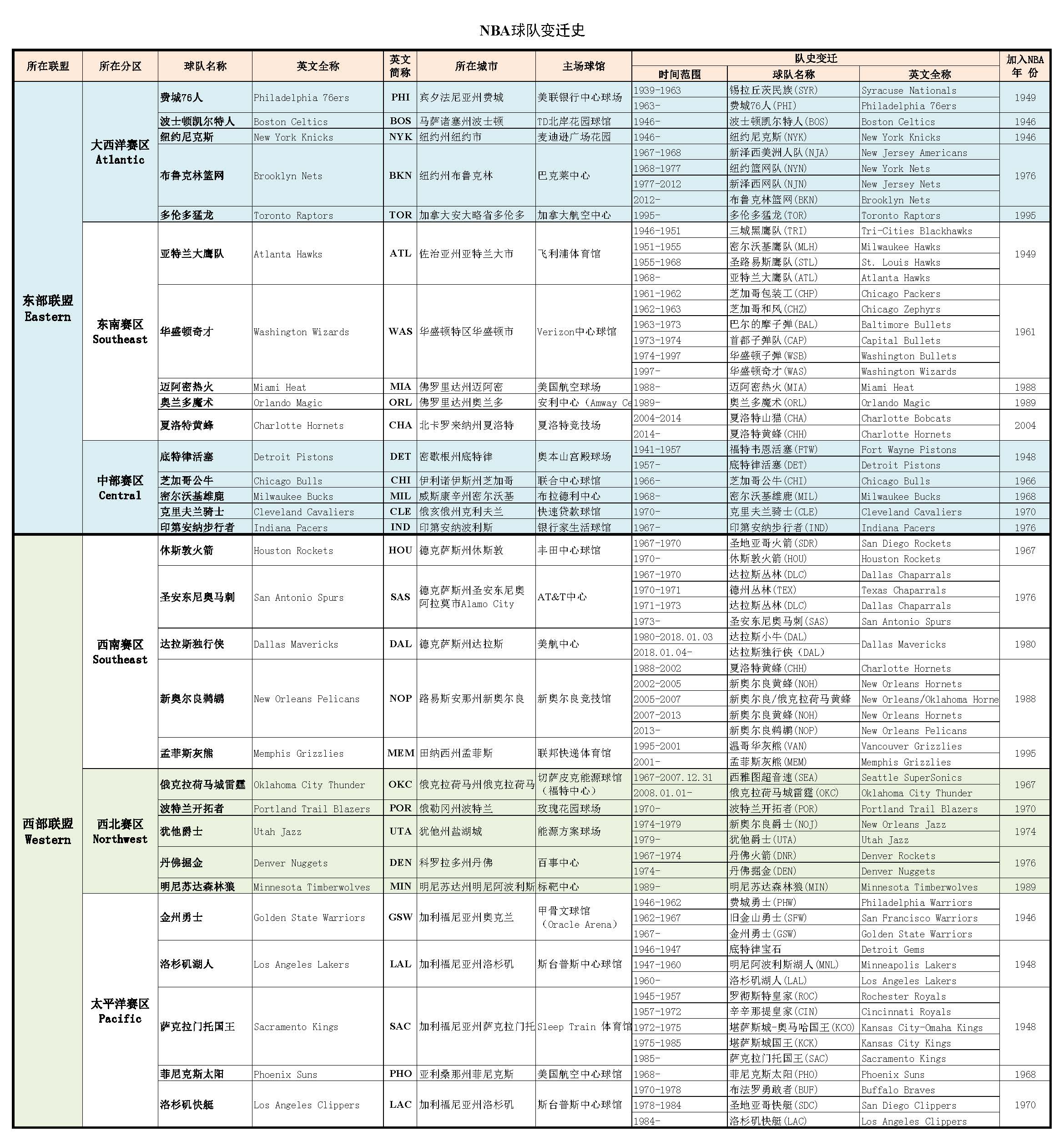 现在看NBA已经不是什么奢侈的事情了。每个球迷心中都有自己的主队,不过我相信,不要查电脑,不要翻资料,在一张白纸上,按照不同分区,能够完整地把30支球队全称或者简称默写出来的人,不会很多。能够熟知每支球队历史变迁的,那就更少了。本篇就用一张图的形式,简单介绍一下各支球队队名的变迁史。