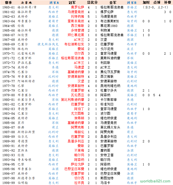 注:1960-61赛季的决赛为主客场两回合制,佛罗伦萨队先客后主。