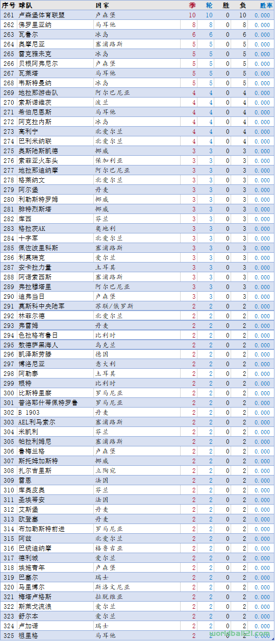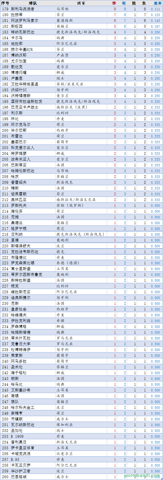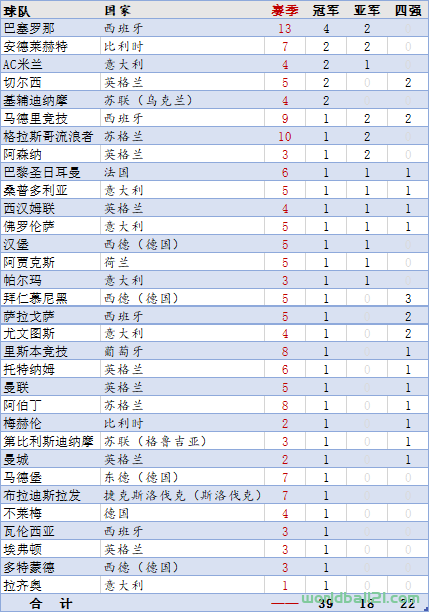 | 序号 | 国家 | 球队数 | 赛季 | 冠军 | 亚军 | 四强 |