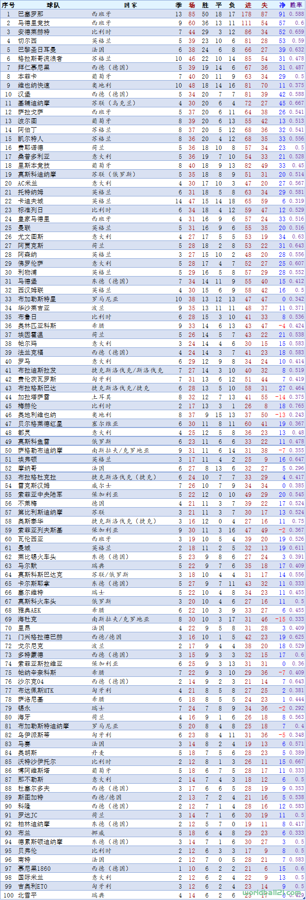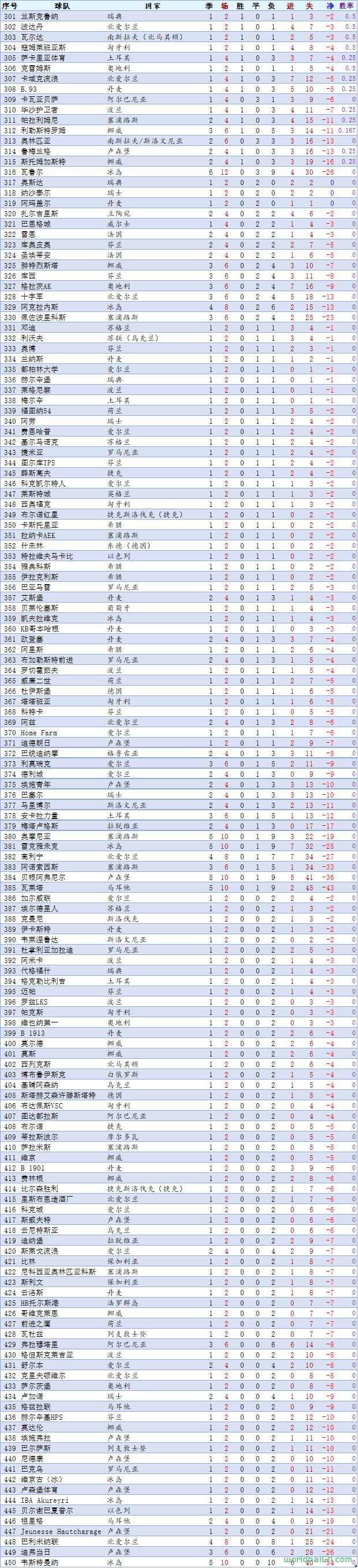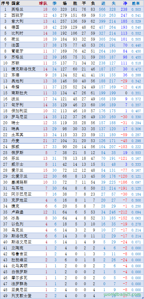 注1:根据各队胜负场次按3分制得分值进行排名,同分则依次比较净胜球、进球、冠军、亚军、四强、八强数。