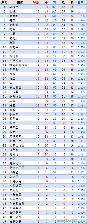 | 2 | 西班牙 | 12 | 43 | 7 | 7 | 5 |