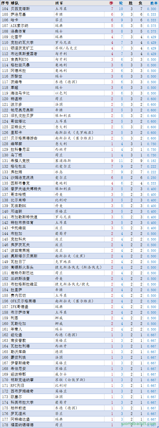因政治原因,苏联、南斯拉夫、捷克斯洛伐克等由一个国家分裂为多个国家,西德、东德则合二为一。除了西德时期的球队成绩统一记为德国的成绩,其他俱乐部的成绩均按不同历史时期的归属国计入该国成绩,而非统一计入其历史归属国或者当前归属国。例如,顿涅茨克矿工队在1991-1992赛季(含)以前的成绩归为苏联球队的成绩,在1992-93赛季(含)之后的成绩归为乌克兰球队的成绩;而第比利斯迪纳摩队在1991-92赛季(含)以前的成绩不会计入格鲁吉亚球队的成绩。