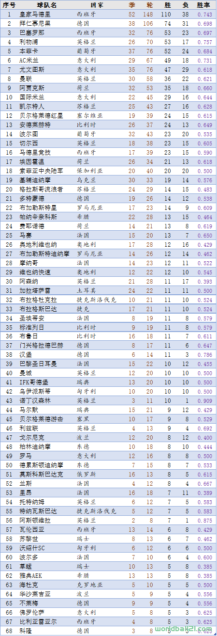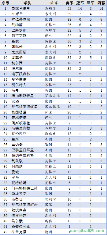 1、冠军榜(球队篇)