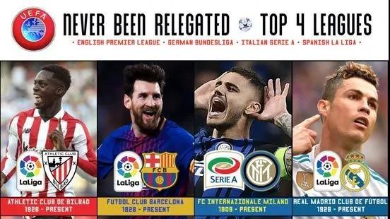 国米是五大联赛中仅有的4支从未降级的球队之一