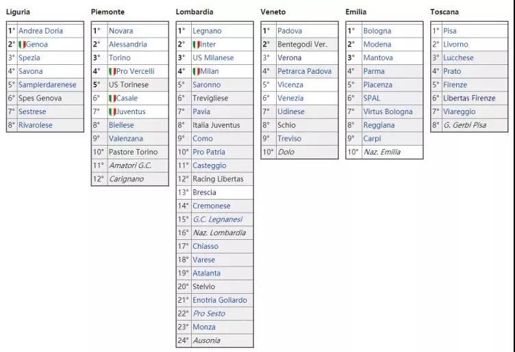 因此在1913年到1921年的近10年间,意大利顶级联赛经历了飞速的膨胀。1920-21赛季,各个大区参加区域联赛的球队多达64支,单是伦巴第大区,就有多达24支球队。