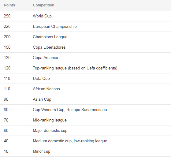 这个模型甚至还考虑了每个赛季转会窗的投入情况:比如说你这个赛季的总投入(转会费+薪资)是联赛平均水平的200%,那么教练在这个赛季的荣誉分就要乘以0.8,相对缩水一些;如果是平均水平的80%,荣誉分则乘以1.2。而三冠王、国际大赛连冠、国内联赛创造积分、进攻、防守等纪录,也会有相应的奖励分。虽然这个模型还有很多地方可以细化,不同的分数比重也可以再完善,但从“量化”荣誉的角度来说,已经考虑得比较周全了。