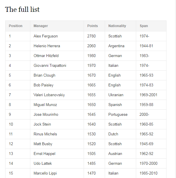 你别说,还真有人根据不同的奖杯构建了一套算分体系,考察教练们执教生涯中获得的“荣誉积分”。《足球万神殿》在2011年7月评选了一次史上50大教练,依据就是他们构建的模型算出来的荣誉累积分数。这套体系还挺完善,比如说他计算联赛冠军的含金量的时候考虑到了欧足联的欧战积分,要知道五大联赛可不是这么多年一直都是欧足联积分前五名的。比如1976年的欧战积分榜,前五名依次是西德、荷兰、英格兰、苏联和意大利。